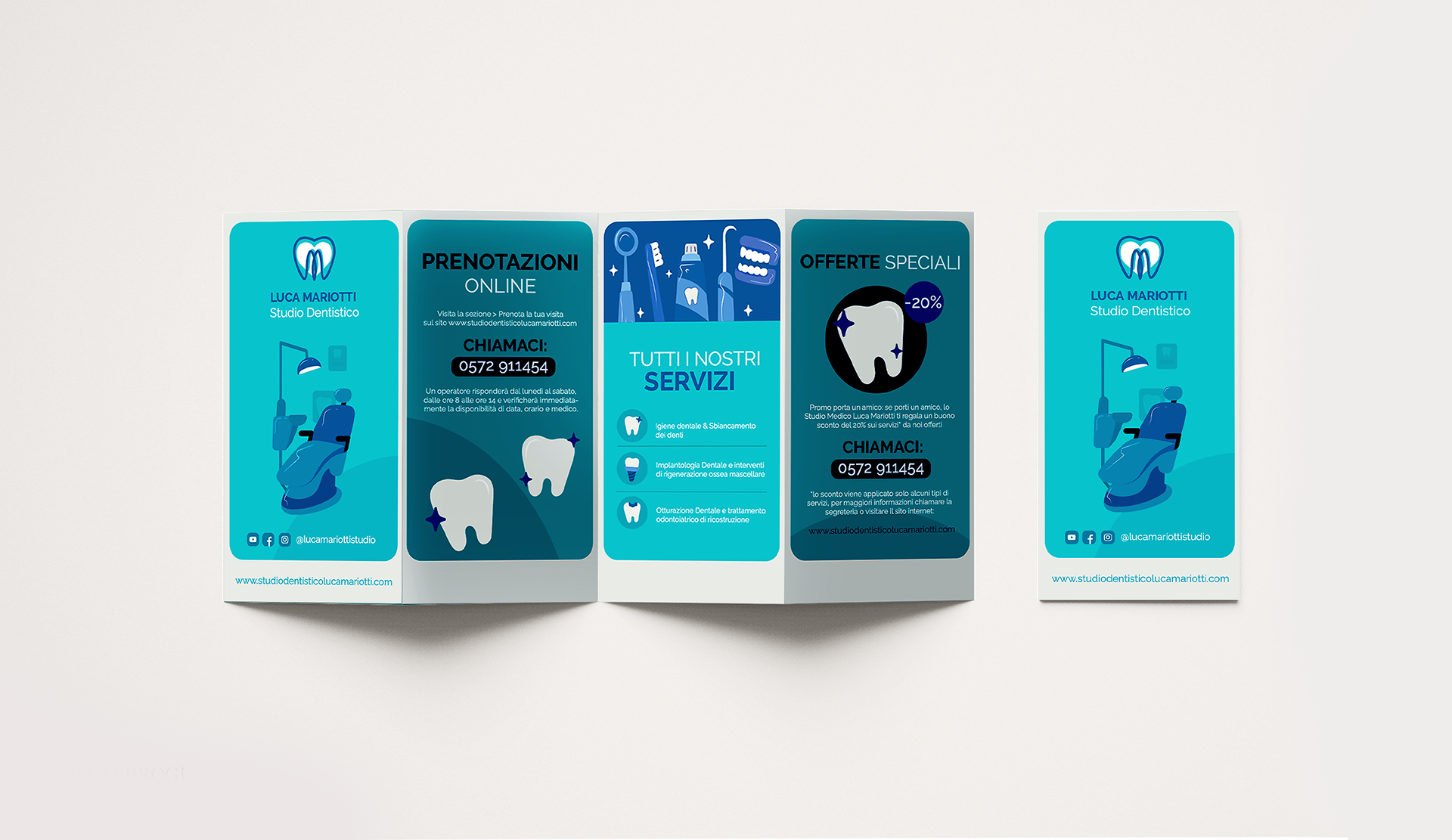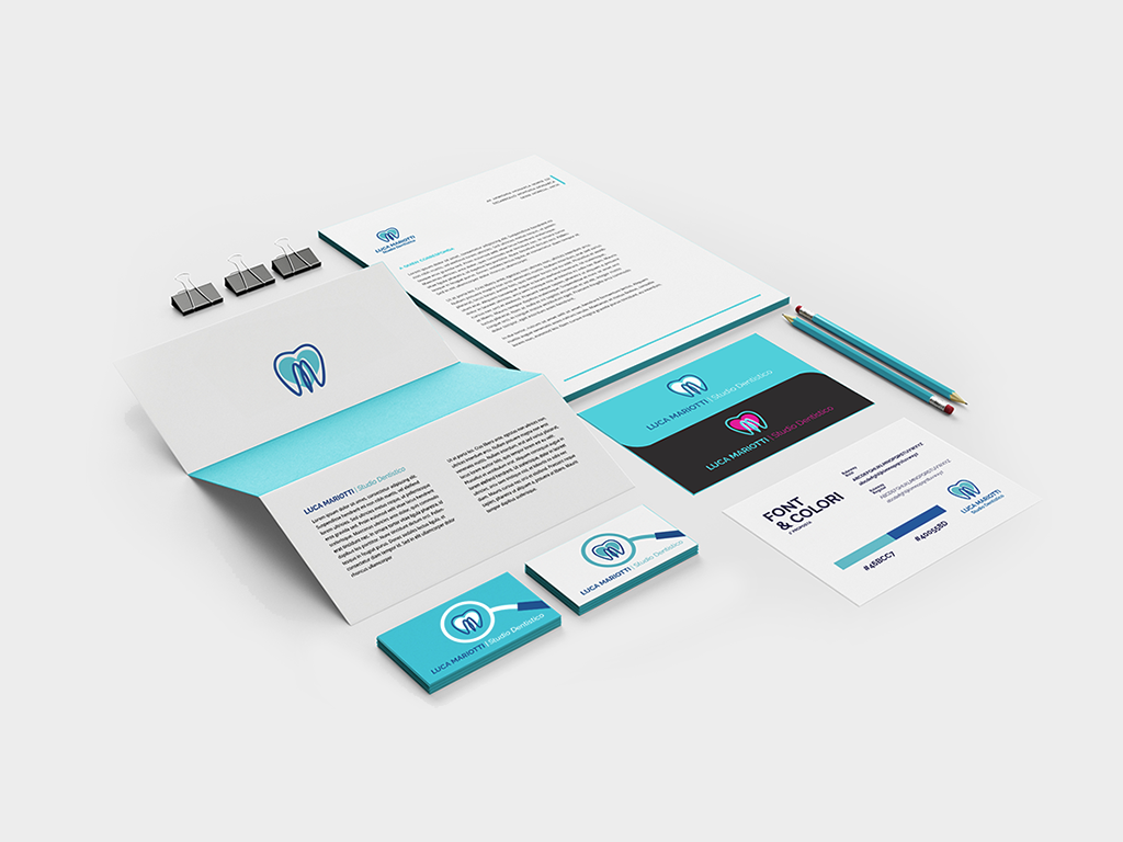 Complete visual identity design for Luca Mariotti’s dental studio, featuring a clean and modern logo, coordinated stationery, and a fresh blue palette to convey trust, professionalism, and care.